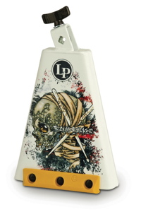 The Latin Percussion Travis Barker Ridge Rider cowbell is an 8″ mountable bell featuring artwork originally designed by Brian “Pushead” Schroeder for the cover of Barker’s most recent album, Give the Drummer Some. The bell is based on LP’s Salsa Sergio model, which has been Barker’s cowbell of choice for years. The pitch is slightly lower than that of the LP Rock Ridge Rider cowbell, and the Barker model features a yellow Jenigor bar to dampen the sound and resist denting. List price: $77.99.