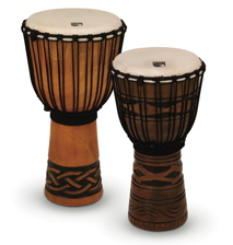 Origin series djembe shells are carved from a single piece of environmentally friendly, plantation-grown mahogany and are turned by lathe to maintain uniform thickness. The interior of the bowl features lathed grooves and a rough-surfaced pattern to help eliminate overtones. The drums’ bearing edges are hand carved to precise specifications. Origin djembes have natural goatskin heads and come in 12×7, 16×8, 20×10, and 24×12 sizes. Two traditional hand-carved designs are available: a classic African mask motif and an intricate Celtic knot pattern.