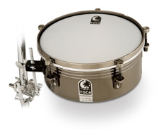 Toca’s Custom Deluxe drumset timbale is 5 1/2″ deep and 12″ in diameter, a convenient size for kit players to incorporate into their setup. The steel shell, which is great for cascara playing, has a black mirror-chrome finish accented with brushed-nickel hardware. The drum has five tuning lugs and comes with a tuning wrench. It includes a mounting bracket that accepts any standard 3/8″ rod. List price: $129.