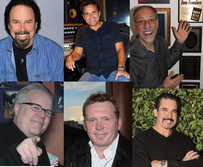 (Pictured above, top to bottom, left to right) The music panel experts for The Sessions at Summer NAMM 2012 includes: Eddie Bayers, Jr. (session drummer), Harry McCarthy (drum tech, owner Drum Paradise), Dom Famularo (The drumming world’s global ambassador), Joe Hibbs (Mapex artist relations/product development manager), Paul Quin (entertainment and litigation lawyer), and Carlos Guzman (production manager).