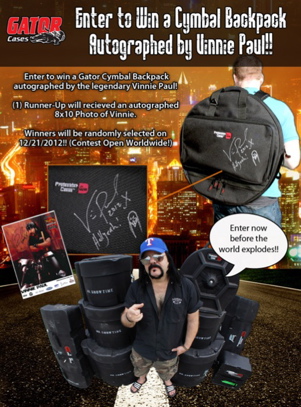 Gator and legendary drummer, Vinnie Paul, are teaming to give away a Gator Cases Deluxe Cymbal Backpack autographed by Vinnie himself.
