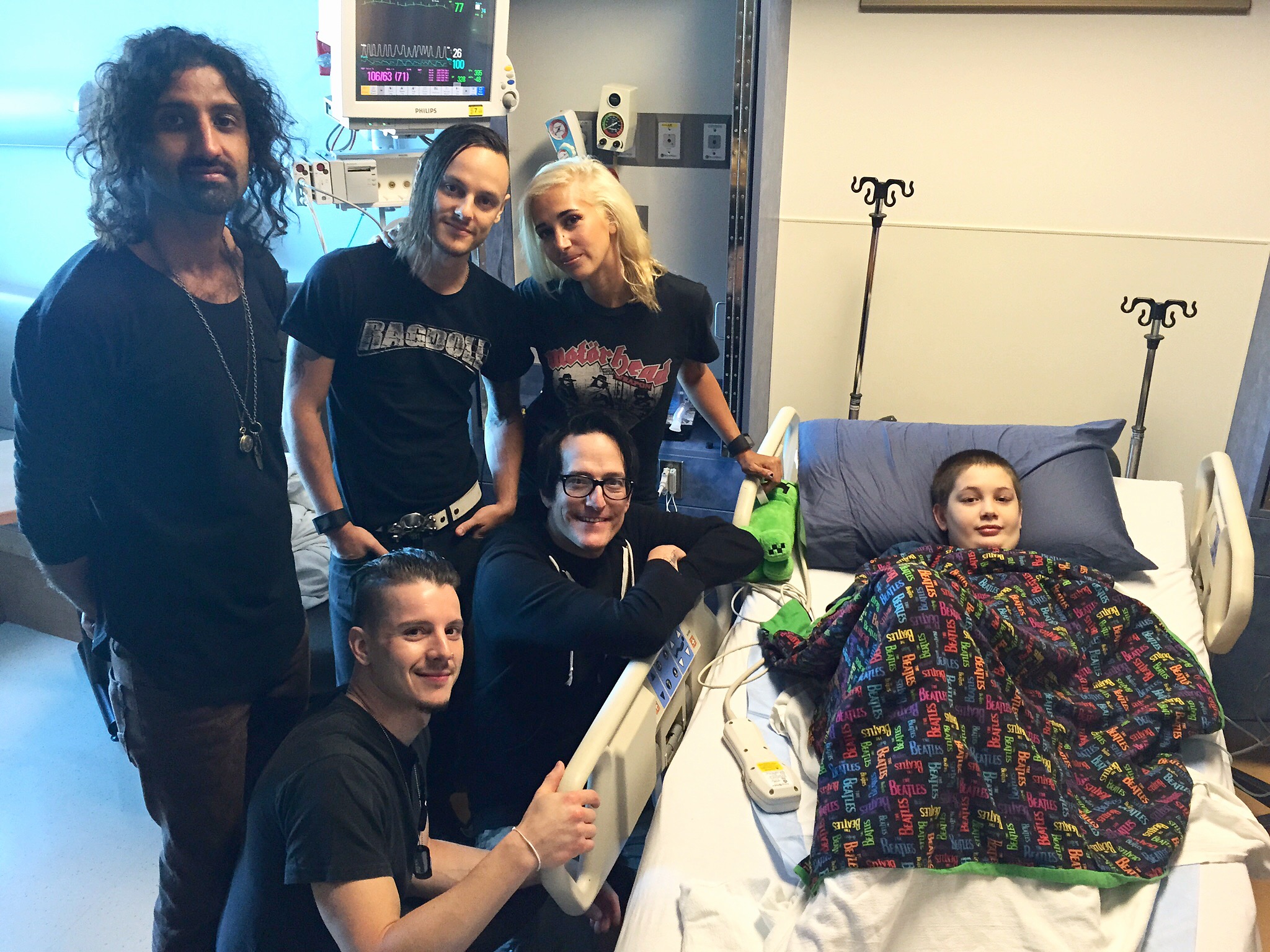 Then, my life changed forever when we flew to Arizona to perform at the Stars of the Season event for Cardon Children’s Medical Center, an annual fundraiser for the hospital’s “Music Is Therapy” program (which Chester Bennington from Linkin Park and his wife are heavily involved in). We arrived a day early to shoot a music video and meet some of the children in the cancer/leukemia wards. As we received the tour of this beautiful facility, our faces lit up with how well they treat the children. Their rooms are a safe haven, not a needle or a drug in sight. There’s a room specially designed to administer their treatments, then they go back to their wonderfully decorated rooms. Then, Dr. David Curran looked at us before entering Room 1 to meet our first little guy and said, “This is where it gets serious.”